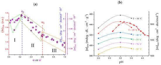 (a) Dependence of the chiro-optical properties of poly(galacturonic acid) in water at 25 °C on α (purple symbols): molar ellipticity at λ = 215 nm (open circles, blue inner scale on r.h.s.) [29]; molar optical activity at λ = 365 nm (crossed-lozenges, purple outer scale on r.h.s.) [29]; ellipticity(arbitrary units) at λ = 208 nm (half-filled circles, red scale on l.h.s. and α as abscissa); ellipticity (arbitrary units) at λ = 208 nm (half-filled circles with magenta small full circle in the core, red scale on l.h.s. and α’ as abscissa) [7]; I, II, III are the three regions defined in Section 2.1; (b) dependence on pH of the optical activity in salt-free aqueous solution: full symbols and connecting curves of different colors at the indicated temperatures for LMP at polymer concentration 0.4 wt% and λ = 436 nm [32]; red open lozenges and dash-dotted connecting curve for poly(galacturonic acid) at 25 °C, polymer concentration 0.47% and λ = 365 nm [29].