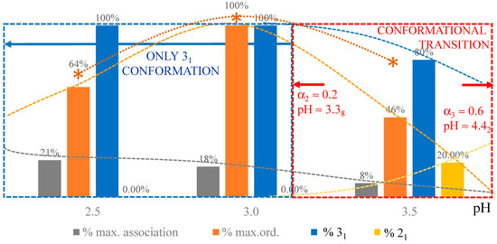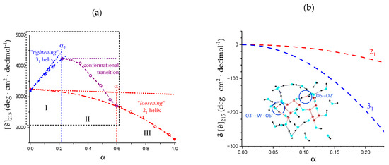 All in all, given the accepted role of chiro-optical data as a monitor of conformational order [32], the convergent results from the data of Figure 7 suggest an increase in conformational order in region I, with a maximum order reached at α ≈ 0.2. This is followed by a neat decrease in ordering accompanying the 31 → 21 transition. Eventually, in region III, the less steep decrease in optical activity indicates that the loss of order of the loosening 21 helix is less than that of the inter-conformation change.