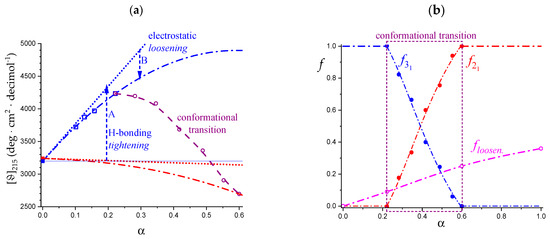 (a) Blow-up of the black short-dashed rectangle of Figure 8a (see for details). The two opposite effects of the increase in charge density on the conformation of the 31 helix have been indicated with A and B; (b) dependence on α of the mole fractions of 31 (blue full circles) and 21 (red full circles) helical conformations calculated from the experimental data of panel (a); magenta open circles; , fraction of repeating units of galacturonan in the “loose” conformation, calculated from calorimetric data (see the discussion in Section 5.1).