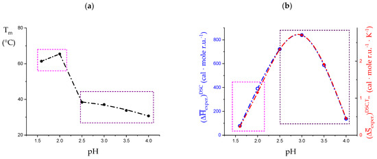 For the calculation of the enthalpy changes in the transition, we resorted to well-known procedures. Both synthetic poly(carboxylic acids) (e.g., poly(acrylic acid), PAA [56]) and natural ones (e.g., alginate [57]) show a “well-behaving” (a “no-bump”) dependence of on α. In the case of pH-induced conformational transitions, the area of the bump-shaped deviations (very often endothermic) from such a “smoothly-behaving” baseline allows for the determination of the thermodynamic parameters of transition [56,58]. Accordingly, the values of the areas between “bump” and baseline (Figure 2) were taken as corresponding to that of the overall variations of enthalpy, , and entropy, , upon transition, calculated over the whole deviation range δ αtr [29]. Their integral values (i.e., normalized per mole of repeating unit, r.u.), calculated as ) and as ), have been reported in Figure 2a,b, respectively. The re-calculated values of and over the δ αconf range from the numerically reproduced curves (Figure 2) were found to be in exceptional agreement with the original values (see Table 1). The intermediate values of and at the intermediate values of α from α1 to α = 1.0 have been reported in Supplementary paragraph 1.