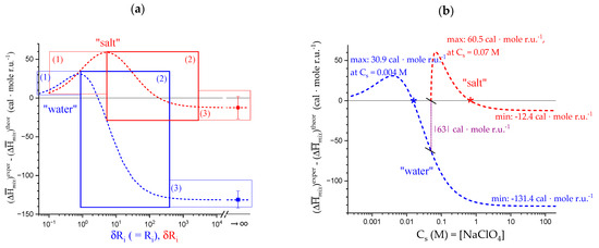 Using the same method as previously used in the case of the system in “salt”, the decoupling of the and values was performed. The results have been reported in Table 2. Both the enthalpic and the entropic values show the same sign as the corresponding ones in “salt”; however, in all cases, the values in “water” are a little smaller than those in “salt”. In the case of the functions, the ratio of the enthalpy change in “water” over that in “salt” is identical to that of the corresponding entropy change (namely, 0.78), whereas, in the case of the functions, the ratio of the values is 0.77 and that of the values is only 0.43. The smaller values of both and in “water” with respect to “salt” will be addressed in Section 2.8.