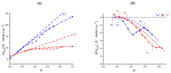 The bump-shaped curves in both panels are very similar to those of Figure 2 in “salt”. Much like the case of the limits of δαconf, those marking δαtr in “water” (δαtr = 0.67, vs. 0.70 in “salt”) also fall at lower values of α compared with those of the system in “salt”: αi = 0.13 (vs. 0.17) and αf = 0.80 (vs. 0.87). Also in this case, the recalculated values of both and over the δαconf range (reported in Table 1) are very close to those in the paper written by Cesàro et al. [29].