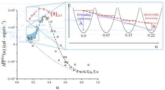 Figure 9a is the blow-up of the area in the dotted rectangle of Figure 8a, to highlight the initial and the transition ranges. The two blue curves describe two opposite effects brought about by the same physical process, namely an increase in charge density; they have been indicated by an upward arrow (A) and a downward one (B). The origin of this seemingly contradictory behavior has been already addressed; a discussion on its possible effect on the curve of the enthalpy of dissociation is postponed to the following Section.