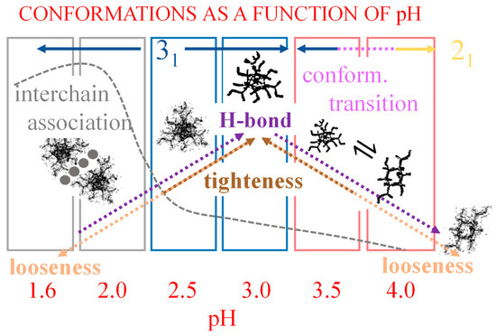 However, in parallel with the described effect, a long-range repulsive interaction between partially charged groups builds up; it is the polyelectrolyte effect correlated with the increase in α. The fact that the difference between all three fitting curves and the tangent to those curves at the beginning of the respective range is negative demonstrates that the increase in charge density produces a generalized loosening of all ordered conformations. The effect is proportional to α with a power larger than 1. As shown in Figure 8b, in region I, the destabilizing effect of loosening produces a much more dramatic decrease in conformational ordering on the 31 than on the 21 helical form. The reason for this is to be traced back to the intrinsic larger stiffness of the former conformation which withstands the electrostatic stress much worse than the intrinsically flexible helix of binary symmetry. At around 20% of group charging, the system starts relaxing the electrostatic stress by undergoing the 31 → 21 conformational transition and the parallel breakdown of the strongly H-bonded 31 conformation. A more comprehensive discussion of the above arguments is referred to in Section 5.2, in view of the viscometric results as a function of supporting salt concentration and ionic strength.