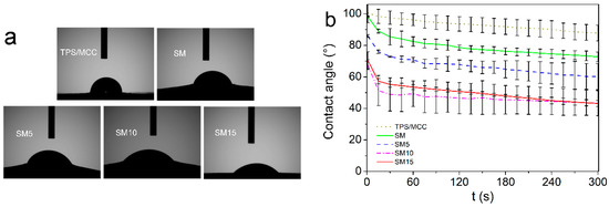 Water contact angle data: (a) Images for the water drop captured at the beginning of the experiment; (b) evolution of the contact angle on the TPS/MCC surface and on the TPS/MCC surface of the bilayer films formed by electrospun CS/EVOH/GA solutions onto TPS/MCC with the addition of GA at 0% (SM), 5.0% (SM5), 10.0% (SM10), and 15.0% (SM15) concentrations. TPS: thermoplastic starch; MCC: microcrystalline cellulose; CS: chitosan; EVOH: poly(ethylene-co-vinyl alcohol); GA: gallic acid.