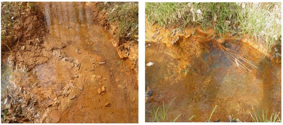Natural red mud-like slugged in a small pound near Zittau, Saxony, Germany. Left: Spring area. Right: Part of a stream from the spring to a small lake. (S. Fränzle 2024©).
