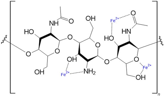 A section of a chitin molecule is presented, along with the potential binding sites for divalent metal ions here using Fe2+-Ions as an example.