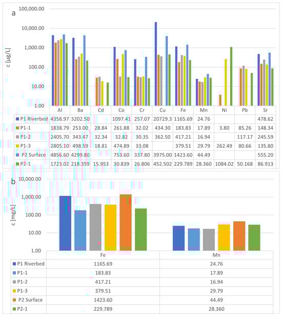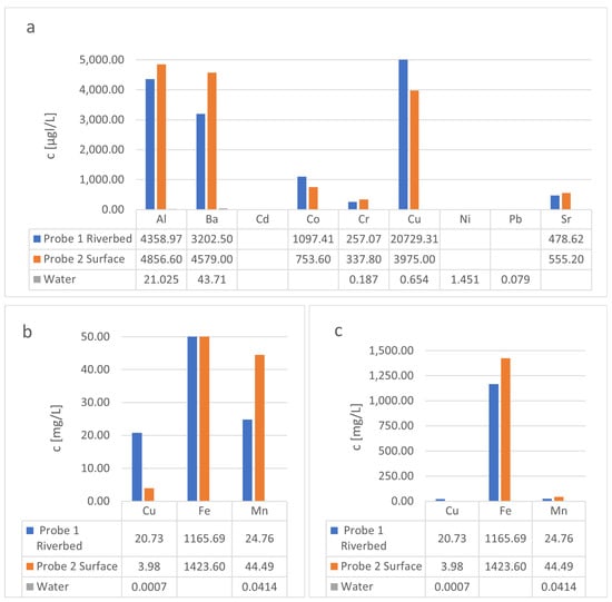 (a–c): Measured concentration of the tested elements in red mud-like sludges from the riverbed and the water surface in relation to the concentration of these elements in the water body. (Blanks meaning the measured concentration was lower than the detection limit).