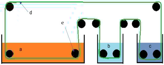 Schematic representation of a possible design of a plant for biomining various elements from red mud with chitin. a: red sludge heap; b: first desorption basin for removing the elements bound to chitin (e.g., LiCl in DMF); c: second desorption basin for removing the elements bound to chitin (e.g., formic acid); d: conveyor belt coated with chitin; e deflection rollers.