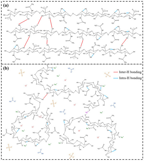 | Ca2+ and Cl− | N.A | The binding of the calcium ions weakens the intramolecular hydrogen-bond network of hyaluronan, increasing the flexibility of the polymer chain. | [35] |