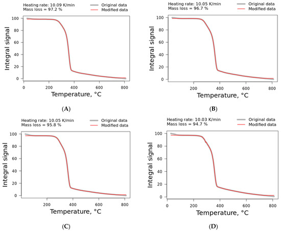 Thermogravimetric curves of the plant fibers studied. (A) Curaua fiber, (B) jute fiber, (C) kenaf fiber, and (D) ramie fiber. Modified data (curve in red) consider TG curves from the corrected heating rate.