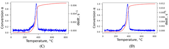 The effect of the heating rate on the conversion degree of curaua fiber at (A) 5 °C·min−1, (B) 10 °C·min−1, (C) 20 °C·min−1, and (D) 40 °C·min−1.