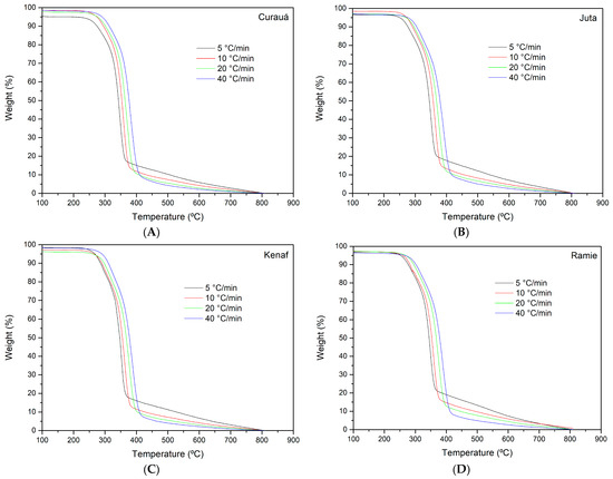 The TG curves for all heating rates are presented in Figure 4. Similar behavior was observed for all fibers, indicating that the similarities in the chemical composition resulted in similar thermal behavior.