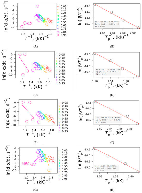 Friedman and Kissinger plots for (A,B) curaua, (C,D) jute, (E,F) kenaf, and (G,H) ramie, respectively. The colors represent the specific conversion degree (on the right side of the Friedman plots), and the circles represent the ln [dα/dt vs. T−1] values for each specific heating rate.