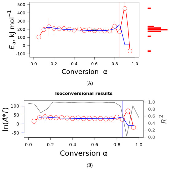 Dependency of the activation energy (A) and pre-exponential factor (B) using Friedman (red color) and Vyazovkin (blue color) plots for curaua fiber. For (A), the red bars with a specific length are the cumulative values for each conversion degree estimated, i.e., the higher the concentration of values at a specific value, the longer the bar. If the numerical values were all the same, only a single and longer bar can be observed. For (B), the gray line represents the correlation coefficient for both methods.
