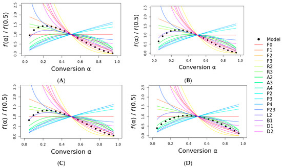 Masterplot using some selected models (linear regression—model fitting). (A) Curaua fiber, (B) jute fiber, (C) kenaf fiber, and (D) ramie fiber. F0—zero order reaction, F1—first order reaction, F2—second order reaction, F3—third order reaction, R2—contracting cylinder, R3—contracting sphere, A2, A3, A4—Kolmogorov–Johnson–Mehl–Avrami nucleation growth, P2, P3, P4, P23—power law, B1—classical Prout–Tompkins, D1—one-dimensional diffusion, D2—two-dimensional diffusion, L2—polymer random scission.