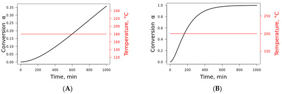 where is the maximum use temperature for a given lifetime . is a function whose values depend on at . The lifetime prediction was estimated based on Equation (11). The principle is based on selecting a determined conversion rate (0% in our case, only differing the temperature—180 °C and 200 °C).