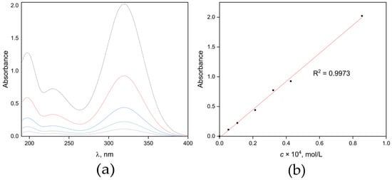 Metronidazole concentration evaluation: (a) UV-Vis spectra of the MTZ solutions; (b) calibration plot for the MTZ concentration evaluation (λmax = 319 nm).