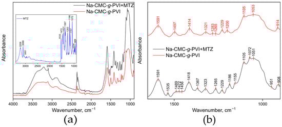 FTIR spectra of the Na-CMC-g-PVI copolymer and its associate with metronidazole: (a) in the region of 900–4000 cm−1 with an inset of MTZ spectrum; (b) in the region of 900–1630 cm−1.