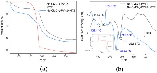 The DSC profile of metronidazole shows an endothermic peak at 164.2 °C, corresponding to its melting point, and an exothermic peak at 270.1 °C due to its decomposition. These results are in good agreement with data published earlier []. In the DSC profile of the associate, these peaks shift to lower temperatures, indicating the partial destruction of the MTZ crystalline structure. Additionally, the glass transition temperature (Tg) value of PVI chains is 144 °C for the Na-CMC-g-PVI copolymer, which is close to the previously published result []. For the Na-CMC-g-PVI and MTZ associates, this value shifts to 125.1 °C. This shift is due to the higher water content of the associate compared to the blank copolymer. Water acts as a plasticizer for hydrophilic PVI chains and can decrease the Tg values.