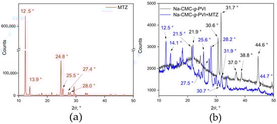 The results of the XRD research also confirm association. According to the data obtained (Figure 4b), the Na-CMC-g-PVI copolymer and its associate have low degrees of crystallinity, as the patterns contain a halo region and some reflexes. Figure 4a shows the metronidazole XRD pattern, demonstrating signals at 12.5, 13.9, 24.8, 25.5, 27.4, and 28.0°, which correlate with previously published data []. These peaks are observed in the XRD pattern of the associate with the Na-CMC-g-PVI copolymer, confirming interaction with the copolymer. Additionally, the intensity of the MTZ signals in the associate’s XRD pattern is lower compared to that of the original drug. This is due to the lower amount of the drug in the associate with respect to the pure MTZ.