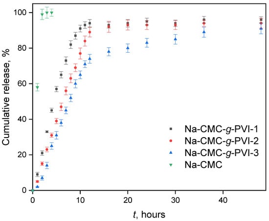 In all the studied copolymer complexes, two distinct stages of release could be observed in the kinetic curves. The first stage involved a rapid or burst release occurring within the initial 10–12 h, followed by a slower release rate after 12 h of incubation. The most pronounced release process was observed when the Na-CMC-g-PVI-1 copolymer was utilized, while the Na-CMC-g-PVI-3 copolymer exhibited the slowest release rate.
