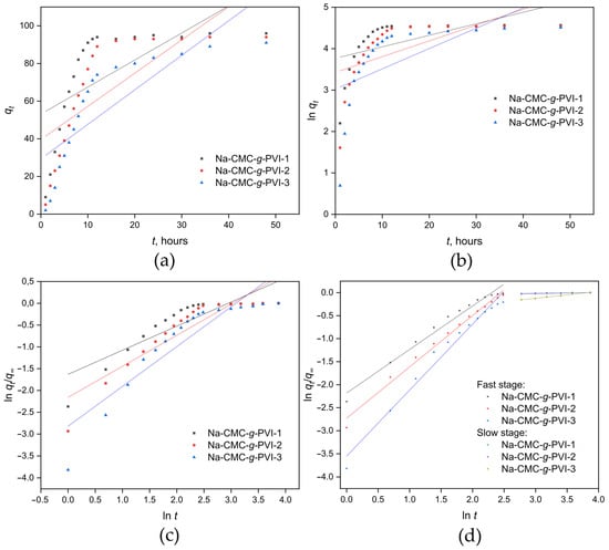 Kinetic models of metronidazole release: (a) zero-order model; (b) first-order model; (c) Korsmeyer–Peppas model; (d) Korsmeyer–Peppas model separately applied for fast and slow stages.