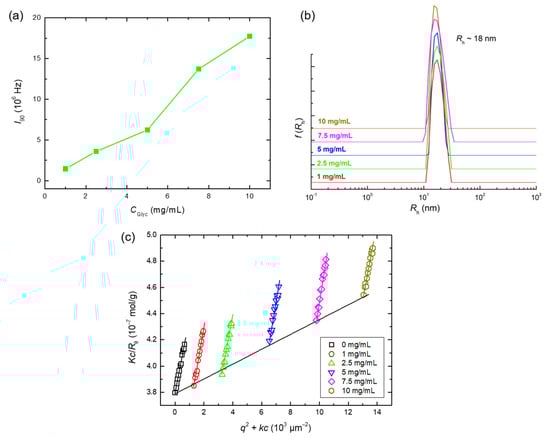 where n0, λ0, NA, and dn/dc are the refractive index of the solvent, the laser wavelength in vacuum, Avogadro’s number, and the refractive index increment of Glyc with respect to the solvent, respectively. For the refractive index increment of the Glyc solutions in WFI, a value of 0.151 mL/g was used according to previous studies [,].