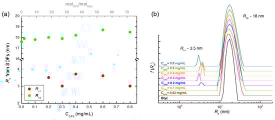 (a) Hydrodynamic radius, Rh, values as functions of CGPb or molGPb/molGlyc derived from (b) the DLS size distribution functions (SDFs) obtained at 90° for the Glyc + GPb complex solutions. The corresponding SDF of free glycogen is also included for comparison.