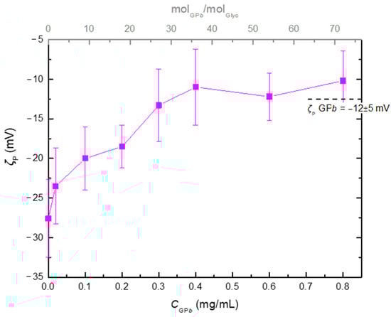 Another physicochemical characteristic of the formed complexes is their effective charge, which was acquired via electrophoretic light scattering (ELS) measurements, yielding the zeta potential ζP values presented in Figure 4 in an identical manner to the previous DLS results. The observed decrease in the absolute value of the zeta potential as the concentration of the enzyme becomes higher is an indication of the charge neutralization that occurs due to complexation. Moreover, for CGPb ≥ 0.4 mg/mL (or molGPb/molGlyc ≥ 36), the zeta potential of the complexes seems to reach a plateau value, similar to that of neat GPb, which was measured at about −12 ± 5 mV. According to these observations, the proposed scenario is that each spherical glycogen molecule binds in its periphery many GPb molecules, resulting in complexes that can be described as glycogen molecules externally decorated with several phosphorylases.