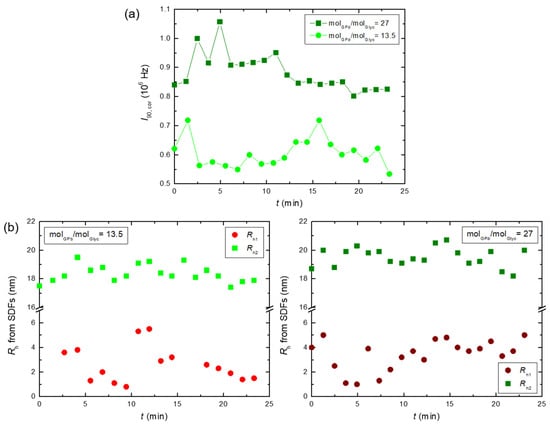 Real-time experiment results: (a) scattered intensity values at 90°, I90, and (b) hydrodynamic radius, Rh, values derived from the corresponding size distribution functions (SDFs) obtained at 90° as a function of time for two different molar ratio values, molGPb/molGlyc = 13.5 or 27.
