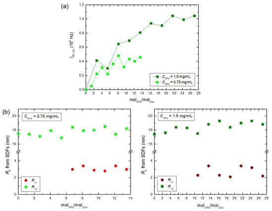 The titration experiment results: (a) the scattered intensity values at 90°, I90, and (b) hydrodynamic radius, Rh, values derived from the corresponding size distribution functions (SDFs) obtained at 90° as a function of molGPb/molGlyc for two different GPb concentration values, CGPb = 0.75 or 1.5 mg/mL.