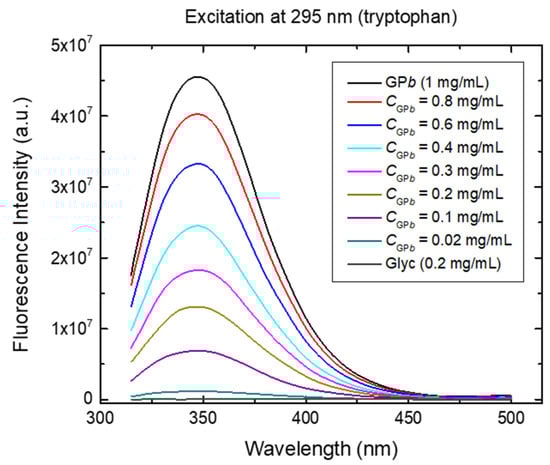 The tryptophane emission spectra (excitation at 295 nm) of the solutions of the Glyc + GPb complexes were recorded to probe the structure of the complexed enzyme. The resulting spectra are shown in Figure 7, where the corresponding spectrum of free/uncomplexed GPb, along with that of free glycogen (which confirms the absence of fluorescence) are also included for comparison. All spectra exhibit the characteristic peak of tryptophane with a maximum at about 350 nm, while the intensity of the peak is directly proportional to the concentration of GPb in the solution (for this reason, the fluorescence spectra of the solutions of the complexes at CGPb = 0.4 and 0.1 mg/mL are directly compared with the corresponding spectra of neat GPb at concentrations of 0.5 and 0.1 mg/mL, as shown in Figure S3). Since there are no significant changes in the tryptophane peak position for the complexed enzyme, it can be concluded that GPb is not subjected to substantial conformational changes when it interacts with glycogen.
