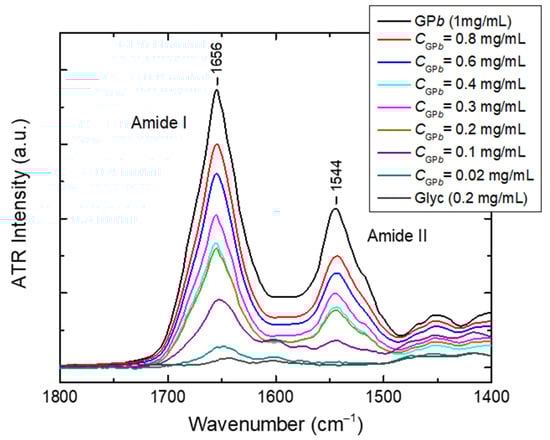 Additionally, infrared (IR) spectroscopy measurements were performed for the determination of the secondary structure of the complexed enzyme. Figure 8 presents the obtained FTIR-ATR spectra of the Glyc + GPb complexes, together with the corresponding spectra of the neat enzyme and glycogen for comparison, in the Amide I and II regions. These peaks mainly represent the vibrational profile of the peptide bond and are characteristic of protein/enzyme samples. As it can be seen, the overall spectral profile (i.e., the maximum position and shape) of both Amide bands is clearly preserved in the complexes with CGPb ≥ 0.2 mg/mL, indicating the absence of significant configurational changes [,]. For the complex solutions at lower CGPb values (i.e., 0.02 and 0.1 mg/mL), both Amide bands are not so well discerned due to the low concentration of the enzyme and the contribution of the spectral characteristics of both Glyc and the used buffer (although its contribution has been subtracted from the spectra, as shown in Figure 8). Nevertheless, no significant spectral shifts that would denote the denaturation of the enzyme are observed. Thus, the results obtained from the FTIR-ATR technique also confirm that the enzyme maintains its native conformation upon complexation.
