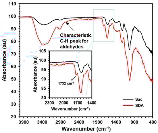 Sacran exhibits distinctive bands at 3328 cm−1, CH2 stretching vibration at 2925 cm−1, polysaccharide (1→4) glycosidic bond stretching vibration at 1144 cm−1, and C-O stretching vibrations at around 1007 cm−1. In SDA, a new peak at 1732 cm−1 reveals the presence of C=O stretching vibration in comparison to unmodified sacran (Figure 1 inset). Periodate can oxidize α-1,4-linked and α-1,6-linked anhydroglucoside units, forming either dialdehyde or aldehyde groups based on the chemical pathway, as reported by Bruneel et al. Also, a slight shoulder at 2726 cm−1 for C-H stretching of aldehyde confirmed the formation of aldehyde functional groups. Additionally, a slightly red-shifted OH signal at 3328 cm−1 suggests that aldehyde or dialdehyde groups were introduced into the sacran chain through oxidation.