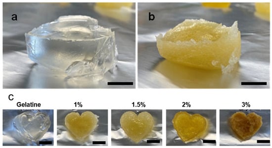 Firstly, a clear gelatine solution was prepared by dissolving gelatine granules in distilled water and continuous stirred for 20 min at 60 °C followed by lowering temperature to 40 °C. The clear solution was poured into silicon mold to obtain clear gelatine hydrogel as shown in Figure 2a, Four different gelatine hydrogels cross-linked with sacran-dialdehyde were synthesized as shown in Figure 2b,c. The preparation process involved the gradual addition of gelatine solution to freeze-dried SDA under continuous stirring. The slow addition and continuous stirring allowed for effective mixing and reaction between gelatine and sacran-dialdehyde, ensuring the formation of covalent bonds along with the subsequent establishment of a three-dimensional network structure. Moreover, the cross-linking density could be manipulated by adjusting the concentration of sacran-dialdehyde in the gelatine solution. As a result, hydrogels with varying degrees of cross-linking were obtained, each exhibiting distinct properties.