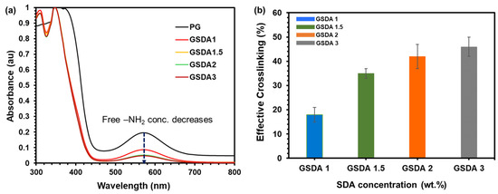 To quantitatively assess the effective cross-linking in gelatine hydrogels, the ninhydrin test was utilized, which measures the presence of unreacted free amines. By employing the following equation, and from the results of UV-Vis spectroscopy of all the samples (as shown in Figure 3a), the extent of cross-linking within the hydrogel samples was evaluated.