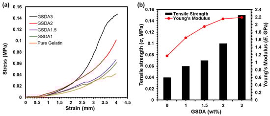 The enhancement of oxidized aldehyde groups for effective cross-linking in gel formation brings about notable improvements in the rigidity and stability of the resulting gels. These findings are depicted in Figure 5. The stress–strain curve shows that the incorporation and systematic increase in GSDA weight% resulted in increased stress with the same mechanical strain, as shown in Figure 5a. The mechanical strength of the gels correlates directly with the degree of cross-linking. This increase in mechanical strength makes the gels capable of withstanding higher applied pressures, particularly evident in the 50% compression tests. Cross-linking plays a crucial role in the mechanical properties of hydrogels, affecting their overall performance [34]. By introducing oxidized aldehyde groups through SDA, the gelatine matrix undergoes a structural transformation, leading to the formation of a robust and rigid network. This strengthened network is characterized by enhanced interactions between the polymer chains, resulting in a cohesive and stable gel structure. The resulting tensile strength with incorporated GSDA samples with varying wt.% is shown in Figure 5b and Table 2.