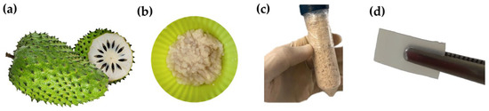 Soursop fruit (Annona muricata L.) (a); hydrated biopolymer from A. muricata residues (Biop_AmRs) (b); Biop_AmRs after purification and drying (c); and (d) Film of Biop_AmRs with glycerol.