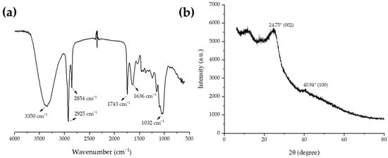 (a) Fourier transform infrared spectrum (FTIR) of Biop_AmRs; (b) X-ray diffractogram of Biop_AmRs.