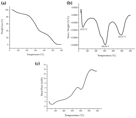 Thermoanalytical analyses are widely used to test raw materials, demonstrate the stability and compatibility of ingredients, and obtain new formulations. In this study, the thermal stability and the decomposition of the Biop_AmRs were examined using TGA, DTG, and DSC, and the results are shown in Figure 3. It is noted that there is a three-step degradation pattern for the sample. The first mass loss stage starts around 50 °C and corresponds to about a 10% mass loss of water in the sample. This loss may be related to hygroscopic moisture and the condensation of hydroxyl groups on the surface of the sample [53,54]. The second mass loss event starts at about 250 °C to 300 °C and corresponds to the main mass loss in a total of 50% of the sample; this stage involves the alteration of functional groups and depolymerization of polymeric structures [55]. The third stage, between 450 °C and 500 °C, corresponds to the oxidation range. The DTG curve (Figure 3a) shows that the Biop_AmRs has a temperature of maximum weight loss rate (Tmwl) of approximately 493 °C. The temperature of maximum weight loss rate (Tmwl) determines the thermal stability of a material. A higher Tmwl indicates greater thermal stability [56]. A similar thermal profile has been observed for other polysaccharides, including pectin [52,57]. The Biop_AmRs demonstrated favorable thermal stability and potential for use in the food and pharmaceutical industries.