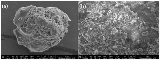 In Figure 4, it is possible to observe the electron micrograph of the Biop_AmRs powder. The Biop_AmRs micrographs showed a spongy, rough, and irregular material. According to Joulak et al. [58], the morphology of polysaccharides can influence their functional, sensory, and physical properties. It is important to note that fibrous aggregates of non-uniform size and distribution affect the intrinsic viscosity and molecular weight of the polymer. Furthermore, as the size of the surface area of a particle increases, consequently, its hydration capacity increases [59]. Polymers that hydrate and swell are important pharmaceutical excipients in controlled drug release matrices [60].
