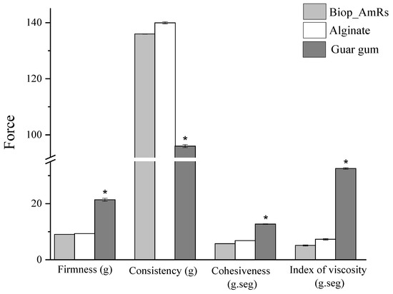 In this study, the texturometric parameters (firmness, consistency, cohesiveness, and viscosity index) of the Biop_AmRs were compared with two biopolymers that are popularly used in the food, cosmetic, and pharmaceutical industries. The results of the texturometric analysis can be seen in Figure 5.