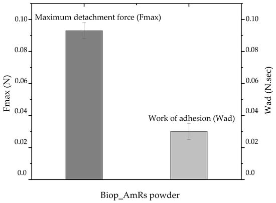 The results of the mucoadhesiveness are shown in Figure 6. The Biop_AmRs powder presented an adhesion force (Fmax) of 0.093 ± 0.005 N and work of adhesion (Wad) of 0.030 ± 0.005 N.s. Mucoadhesion is a complex process that involves intimate contact between two surfaces, one of which must be a mucosal tissue or membrane and the other a mucoadhesive material [78,79]. This process occurs in two stages, the first related to the first contact between the mucoadhesive material and the mucosa and the second, the consolidation phase, involving secondary physical and chemical interactions such as hydrogen bonds, van der Waals forces, and electrical attractions [80]. In general, polymers that have many hydrophilic groups have a higher mucoadhesive potential; this ability is strongly impacted by a variety of variables, including chain flexibility, molar mass, molecular charge, crosslinking density, ionic strength, and moisture level [81].