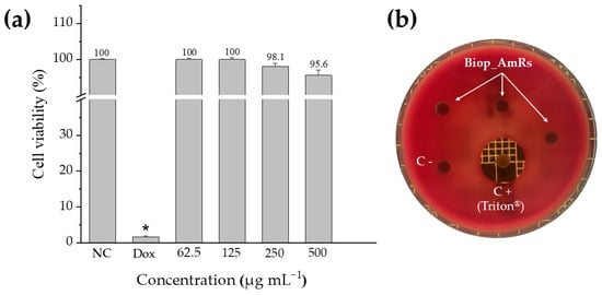 (a) Cell viability percentage of the Biop_AmRs evaluated using the MTT test after 72 h of exposure on the L929 cell line. (Triplicate assays; mean ± SEM), NC: negative control. Doxorrubicin (Dox) was used as a positive control. (b) Blood agar plate with Biop_AmRs sample and negative and positive controls (Triton). * p < 0.05 vs. NC of Dox using Dunnet’s t-test.