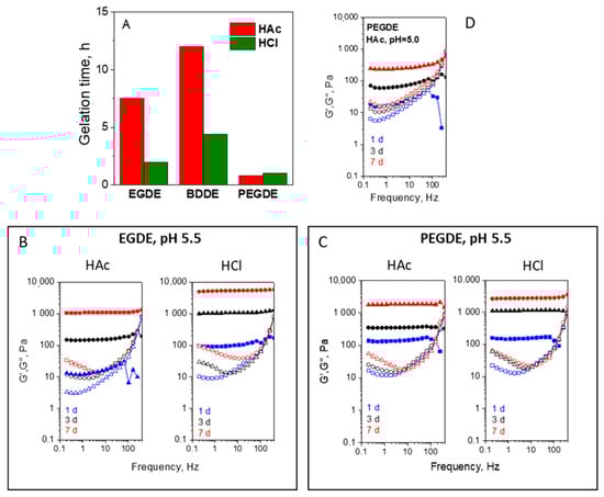 Gelation time in 3% chitosan (CH) solutions in acetic and hydrochloric acids, pH 5.5, DE:CH molar ratio of 1:1, T = 25 °C (A). Frequency sweep tests in 3% CH solutions in acetic and hydrochloric acids (DE:CH molar ratio of 1:1) after 1st (1d), 3rd (3d), and 7th (7d) days of gelation: cross-linking with EGDE, pH 5.5 (B); PEGDE, pH 5.5 (C); PEGDE, pH 5.0 (D). Closed symbols are storage moduli (G′), and open symbols are loss moduli (G″).