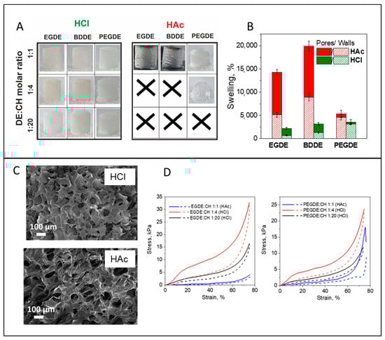 Images of chitosan (CH) cryogels obtained at different DE:CH molar ratios from 3% CH solutions in HCl and HAc, pH 5.5; “×” means that mechanically stable cryogel was not obtained (A). Swelling in water of CH cryogels obtained at a DE:CH molar ratio of 1:1 from 3% CH solutions in HCl and HAc, pH 5.5 (B). SEM images of EGDE:CH 1:1 cryogels obtained from HCl and HAc solutions, pH 5.5 (C). Strain–stress curves of uniaxial compression (loading–unloading cycle) of the swollen CH cryogels obtained by CH cross-linking with EGDE and PEGDGE at different DE:CH molar ratios in HCl and HAc solutions, pH 5.5 (D).