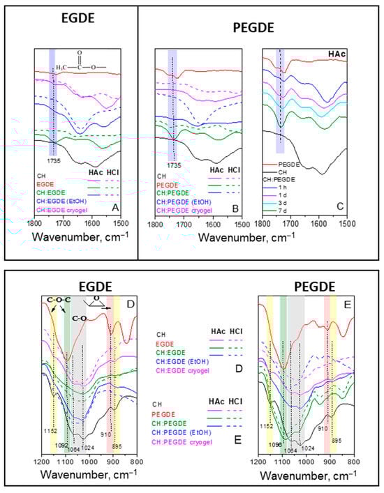 Figure 3A,B show that the band at 1735 cm−1 appeared only in reaction mixtures of CH with EGDE and PEGDE in acetic acid, which proves the formation of esters at least in one of the possible side reactions (Scheme 2, reactions 2 or 5). The relative intensity of the band at 1735 cm−1 increased over time from 1 h to 7 days (Figure 3C). This shows that PEGDE was consumed in both target and side reactions, since the storage moduli of the reaction mixture (Figure 1C) also increased during this period. The absence of this band in the spectra of hydrogels washed with water and ethanol (Figure 3A,B) suggests that at room temperature, the side reaction proceeds without CH participation (Scheme 2, reaction 2). At the same time, a small shoulder in this region for CH:EGDE (EtOH) hydrogel does not exclude esterification of the terminal epoxy group in the EGDE graft completely (Scheme 2, reaction 5). After reaction at subzero temperatures, the band at 1735 cm−1 in the spectrum of EGDE-cross-linked cryogel was identified more undoubtedly, confirming EGDE graft esterification. Since esterification blocks further participation of the second epoxy group of EGDE in cross-linking reactions in acetic acid solution, the mechanical properties of EGDE-cross-linked hydrogel (Figure 1B) and cryogel (Figure 2D) were much more weaker in comparison with those of PEGDE-cross-linked ones (Figure 1C and Figure 2D).