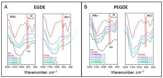 Detailed analysis of the reaction mixtures’ spectra in the region near 910 cm−1 over time from 1 h to 7 days confirmed the faster opening of EGDE epoxy rings in acetic acid solution (Figure 4A); in the HCl solution, unreacted epoxy groups were identified after 3 days of gelation, while in acetic acid, corresponding bands partially overlapped with C-O-C symmetric vibrations in CH, shifted to lower wavenumbers after 1 day of gelation, and disappeared by the 3rd day. This correlates to a drastic drop in the strength of EGDE-cross-linked hydrogel formed from acetic acid solution (Figure 1B). The reactivity of PEGDE in acetic acid was lower, and unopened epoxy rings were identified in the reaction mixture at least up to the 3rd day of gelation, thus making cross-linking more efficient in comparison with EGDE (Figure 4B).