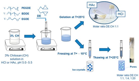 All the above stimulates the search for alternative cross-linking methods using natural cross-linkers, such as genipin [12], or conducting reactions in partially frozen media, where lower amounts of cross-linkers can be sufficient due to the cryoconcentration effect [13]. The latter approach results in the formation of cryogels, which demonstrate advantages over hydrogel analogues in toughness, elasticity, responsivity against external stimuli [14,15], and flow permeability [16]. However, due to its low reactivity, genipin is not efficient at subzero temperatures, which limits its applicability to the cross-linking of lyophilized and neutralized CH scaffolds yielding so-called macroporous cryostructurates [12]. A similar multi-step approach was applied to the fabrication of porous CH materials via solvent replacement in a frozen solution and subsequent structure stabilization using diglycidyl ether of polyethyleneglycol (PEGDE) in alkaline medium at 60 °C [17].